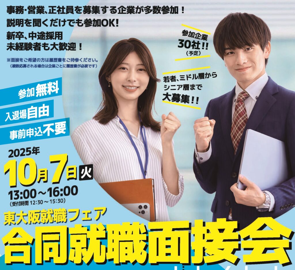 【予約不要】合同就職面接会 東大阪就職フェア 10月7日㈫開催